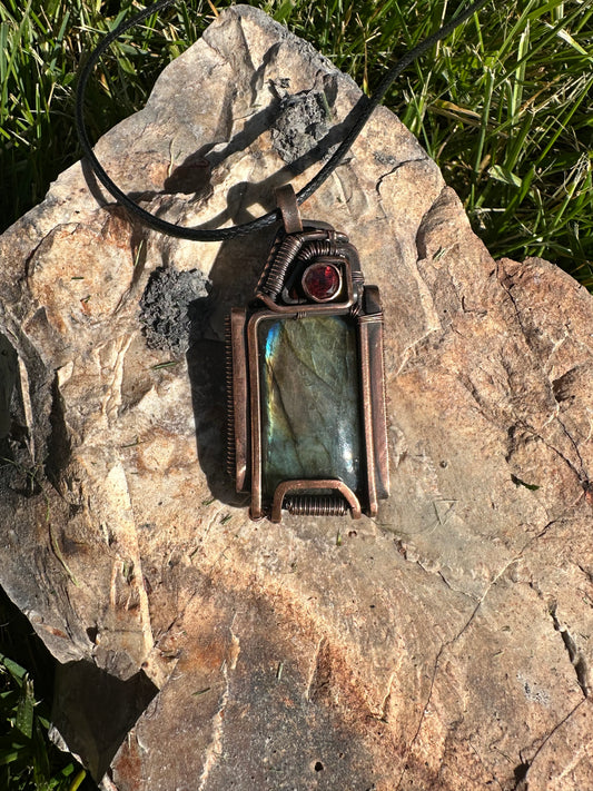 Labradorite & Red Garnet Pendant, Oxidized Copper Pendant