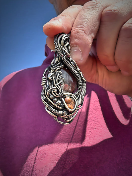Labradorite & Moonstone Wire Wrapped Pendant with Mushroom Accents - #1