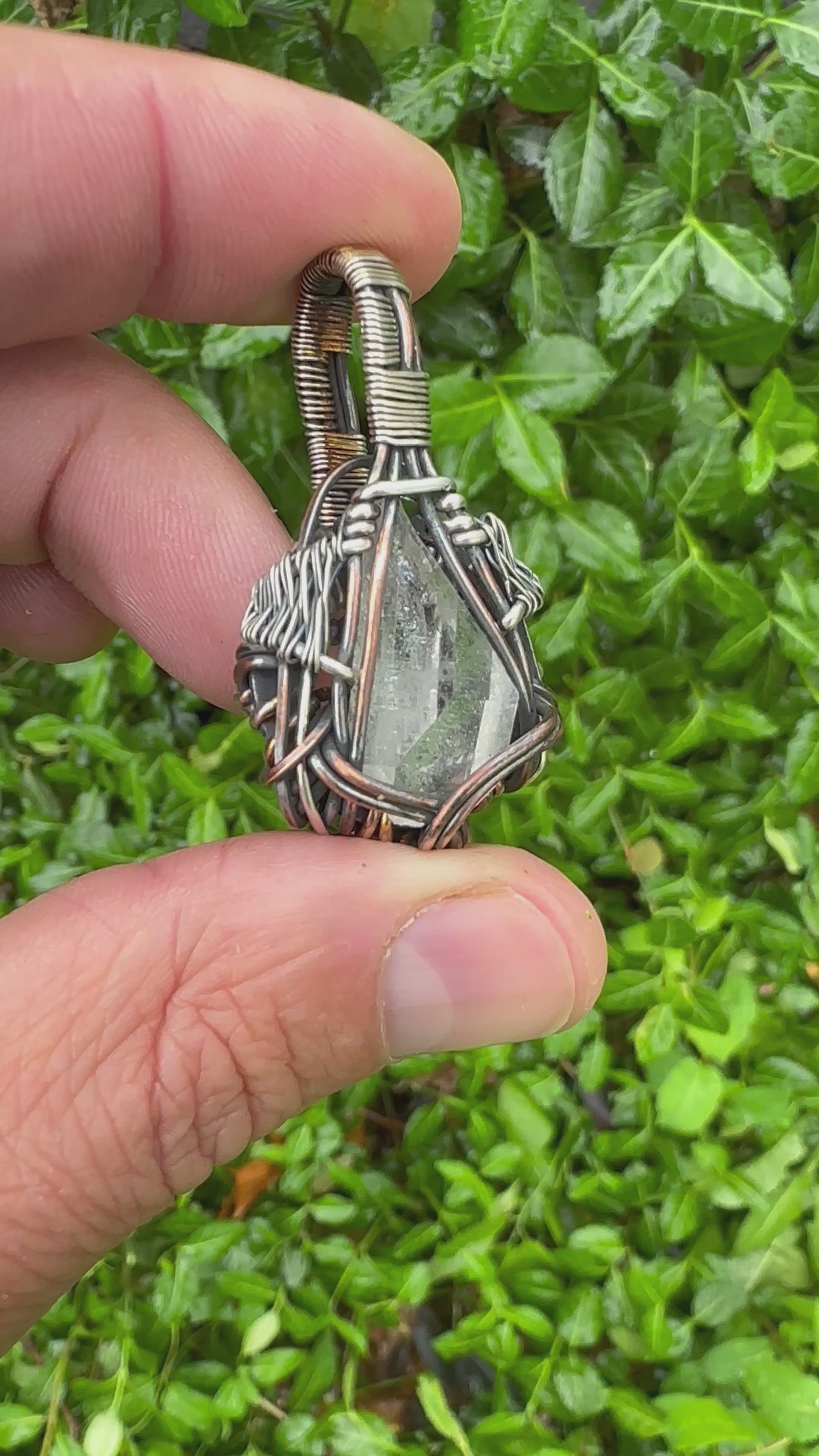 Oxidized .925 Sterling Silver & Copper pendant holding aΒ hand mined Quartz cluster from the deep mountains of Arkansas. This pendant is unadulterated and resonates at a high frequency, cleansed in water and charged under the sun and moonlight.Β