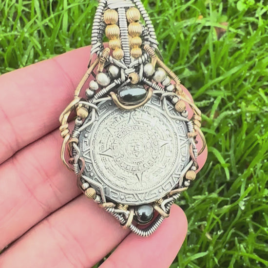 Sterling silver and 14k gold fill wire protect the Aztec Calendar symbolizing time, cycles, and divine balance, guiding spiritual harmony. Shungite, with purifying properties, and the Flower of Life’s sacred geometry etching promote grounding, EMF protection, and interconnectedness.