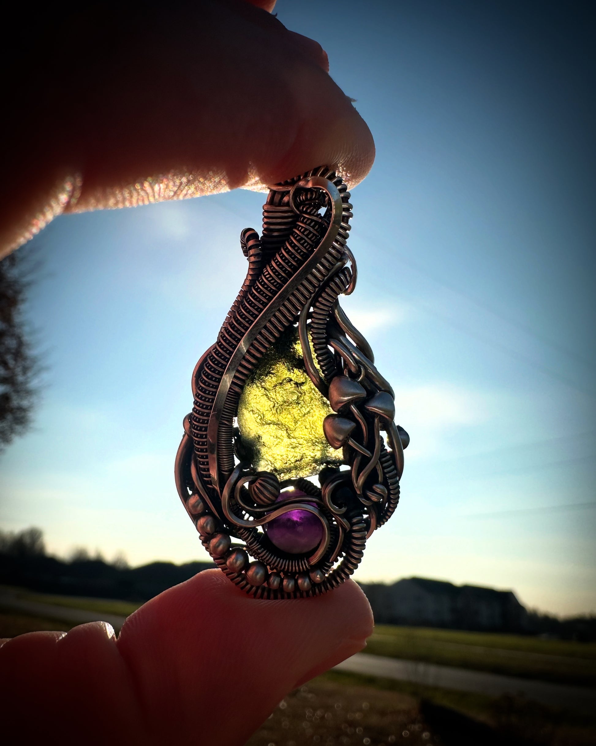 • Stones: Raw Moldavite (transformation, cosmic connection) and Amethyst (calm, protection)