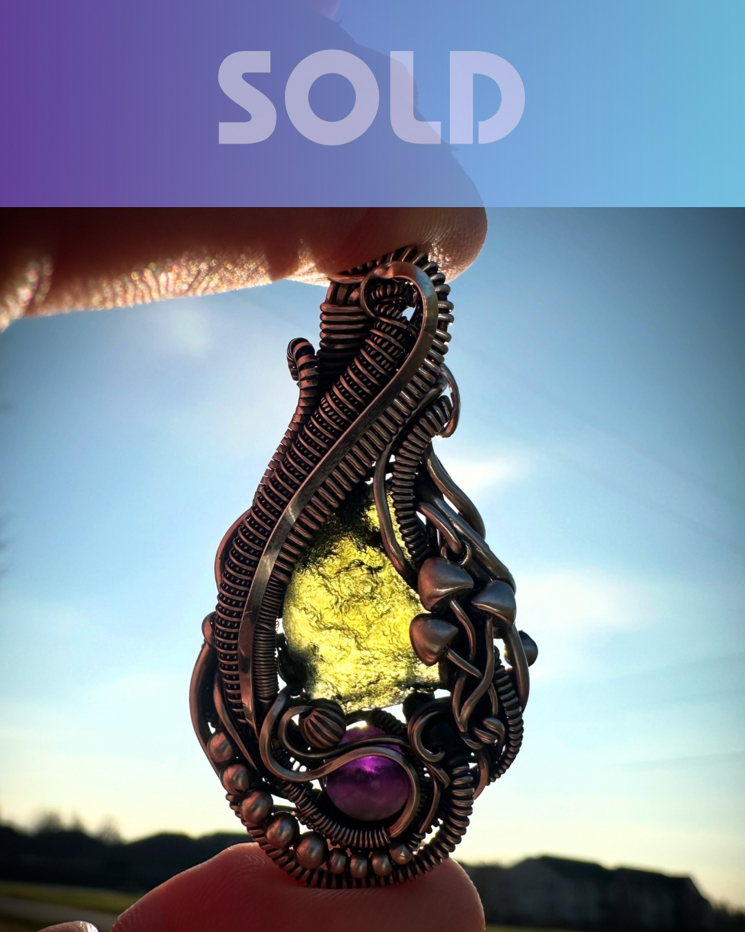 • Stones: Raw Moldavite (transformation, cosmic connection) and Amethyst (calm, protection)