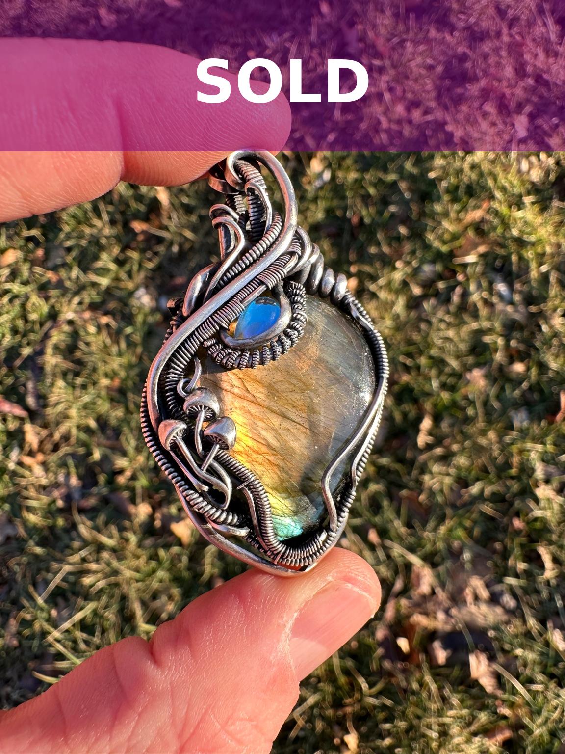 SOLD - Labradorite & Moonstone Wire Wrapped Pendant with Mushroom Accents - #2