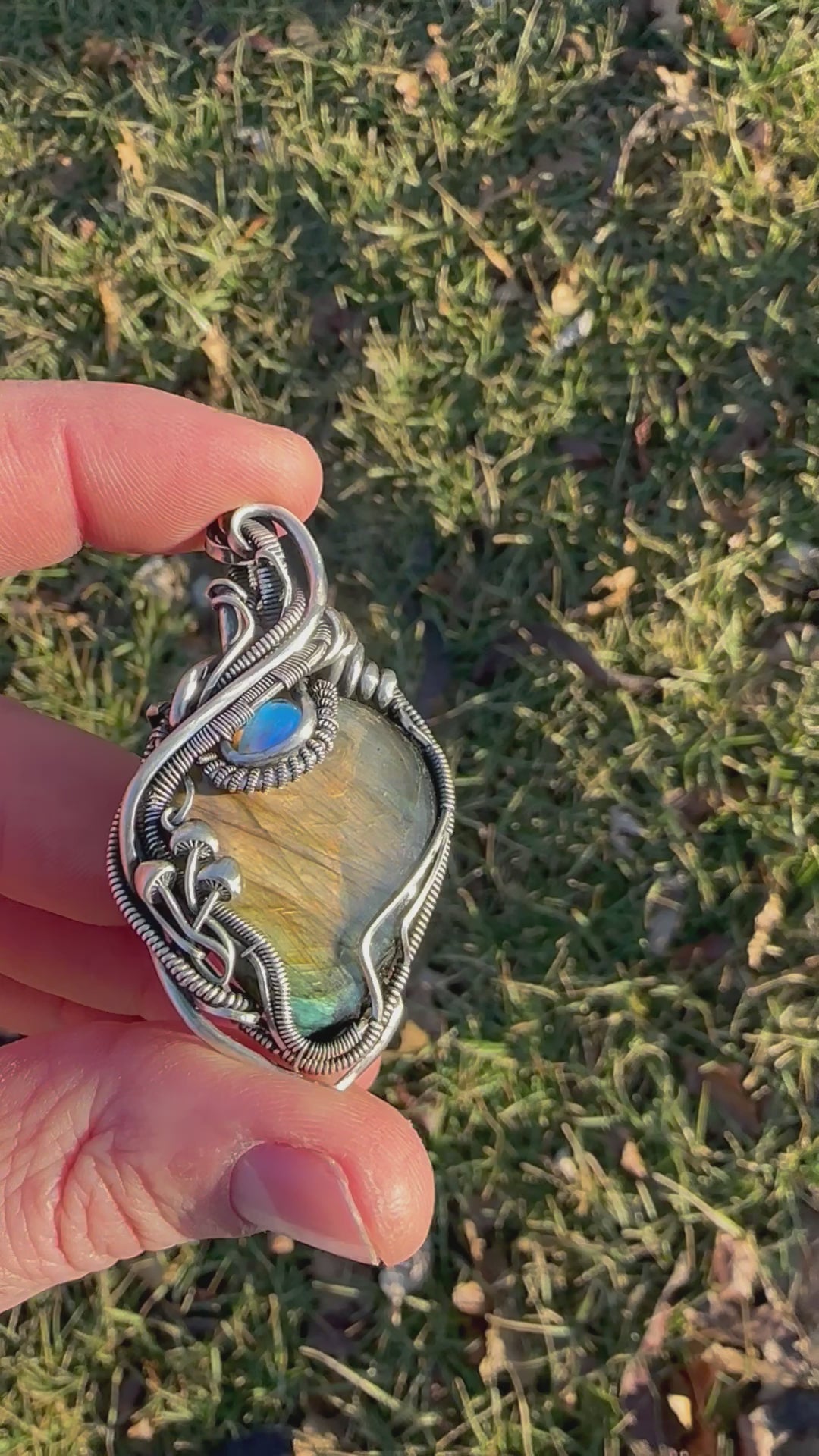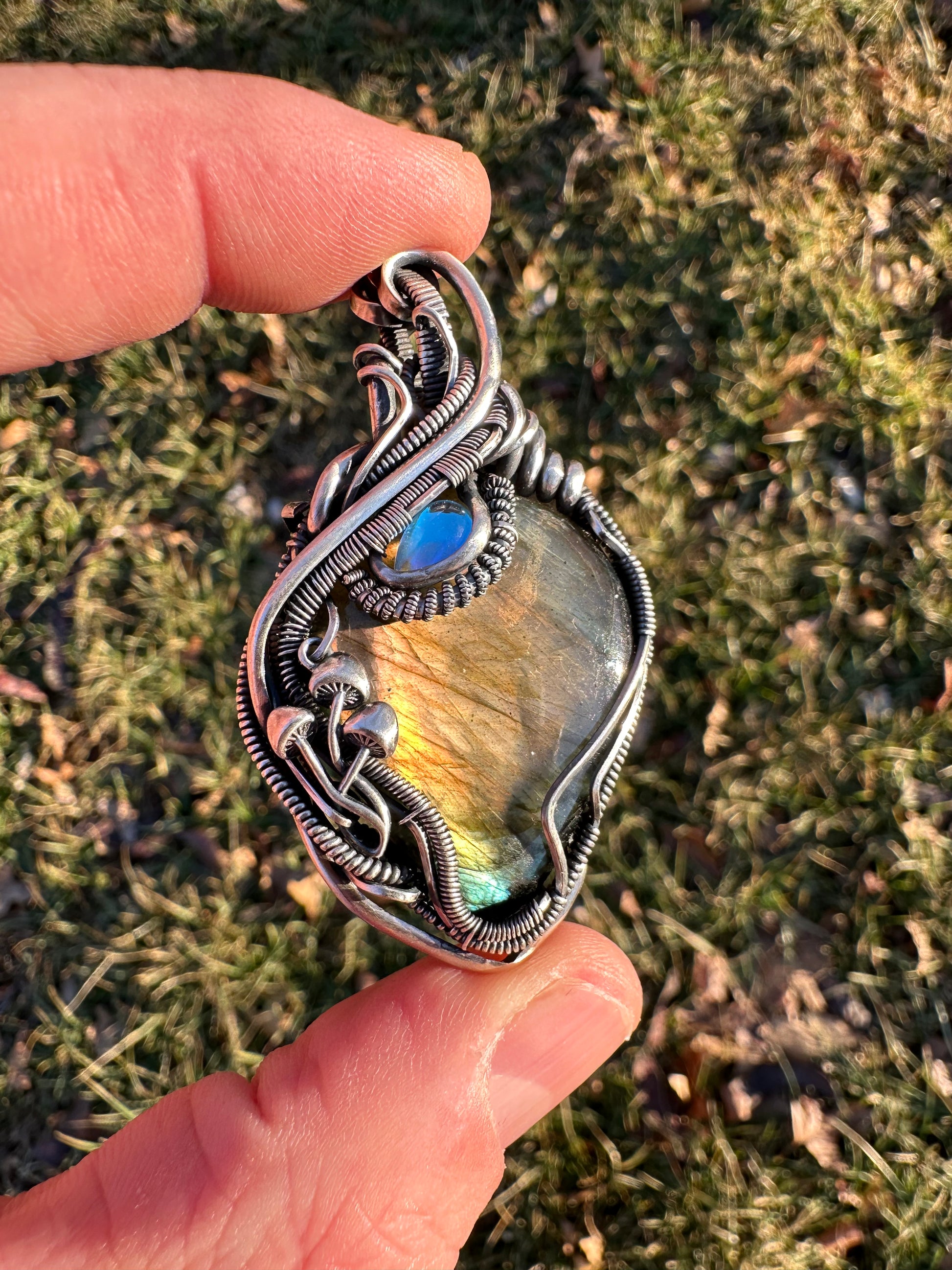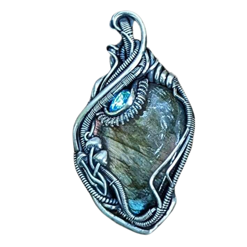 Feel the interplay of light and magic with this pendant. This exquisite piece features labradorite and moonstone, hand wrapped with wire and delicate mushroom accents to create a talisman of transformation.