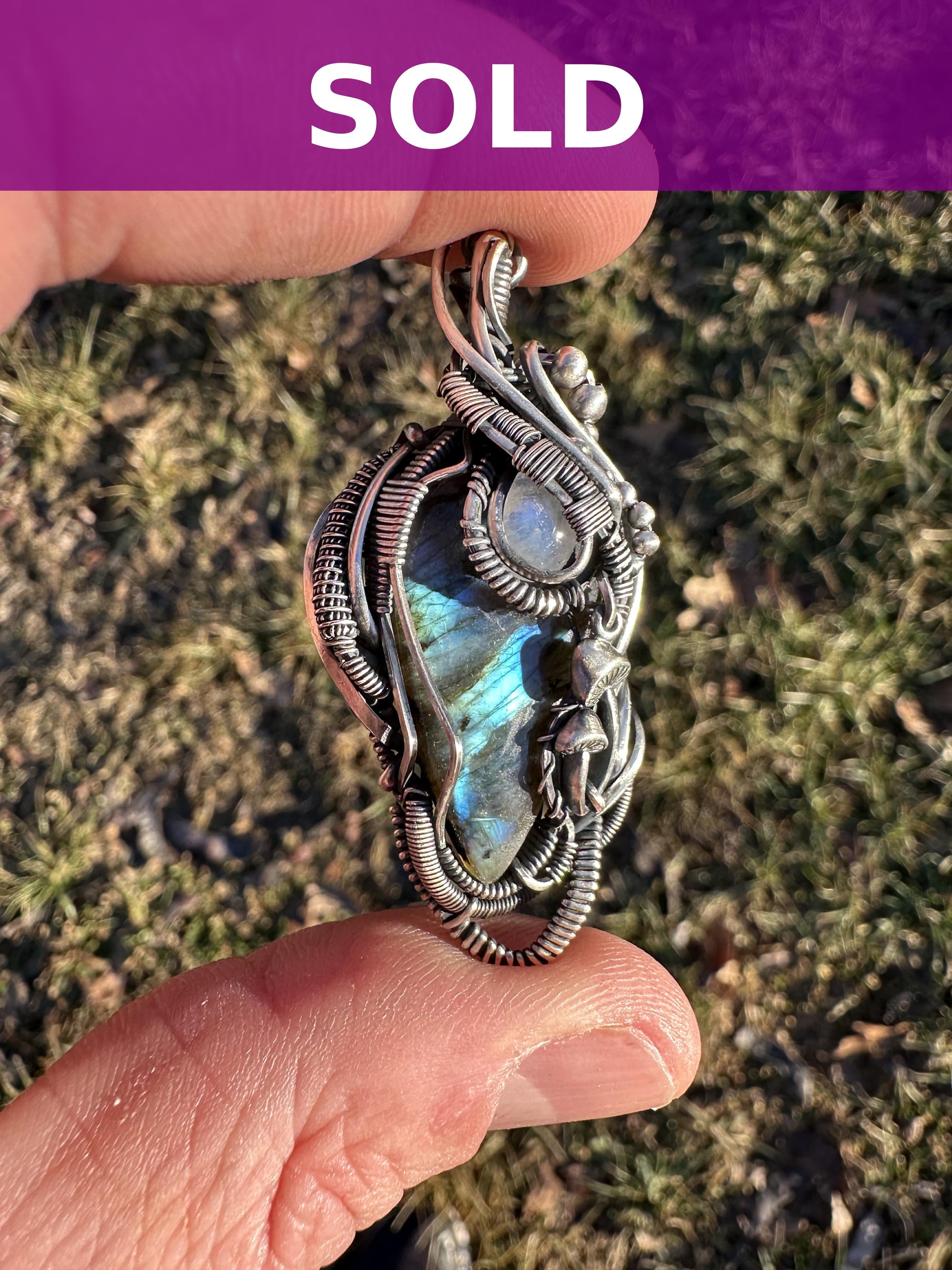 SOLD - Labradorite & Moonstone Wire Wrapped Pendant with Mushroom Accents - #4