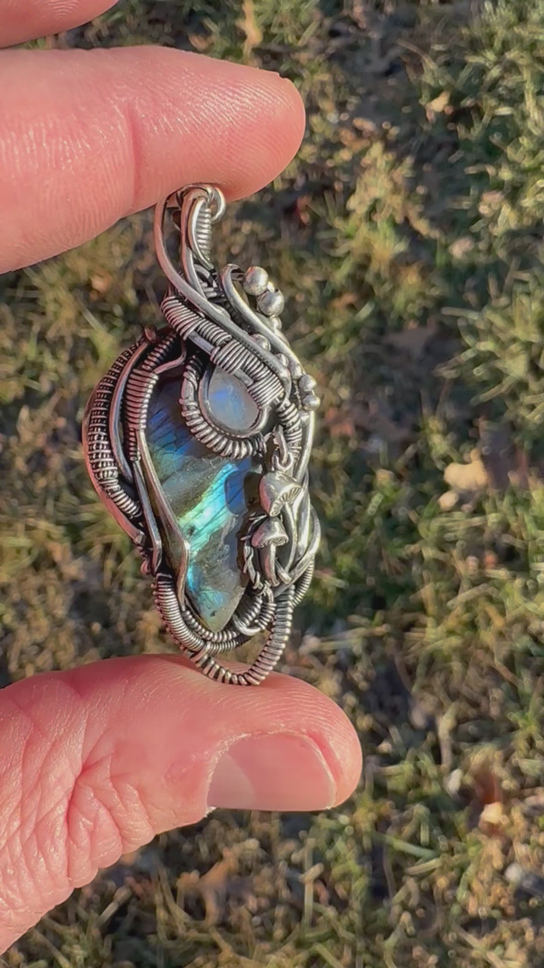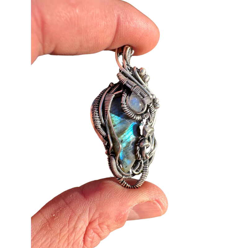 Feel the interplay of light and magic with this pendant. This piece features labradorite and moonstone, hand wrapped with wire and delicate mushroom accents to create a talisman of transformation.