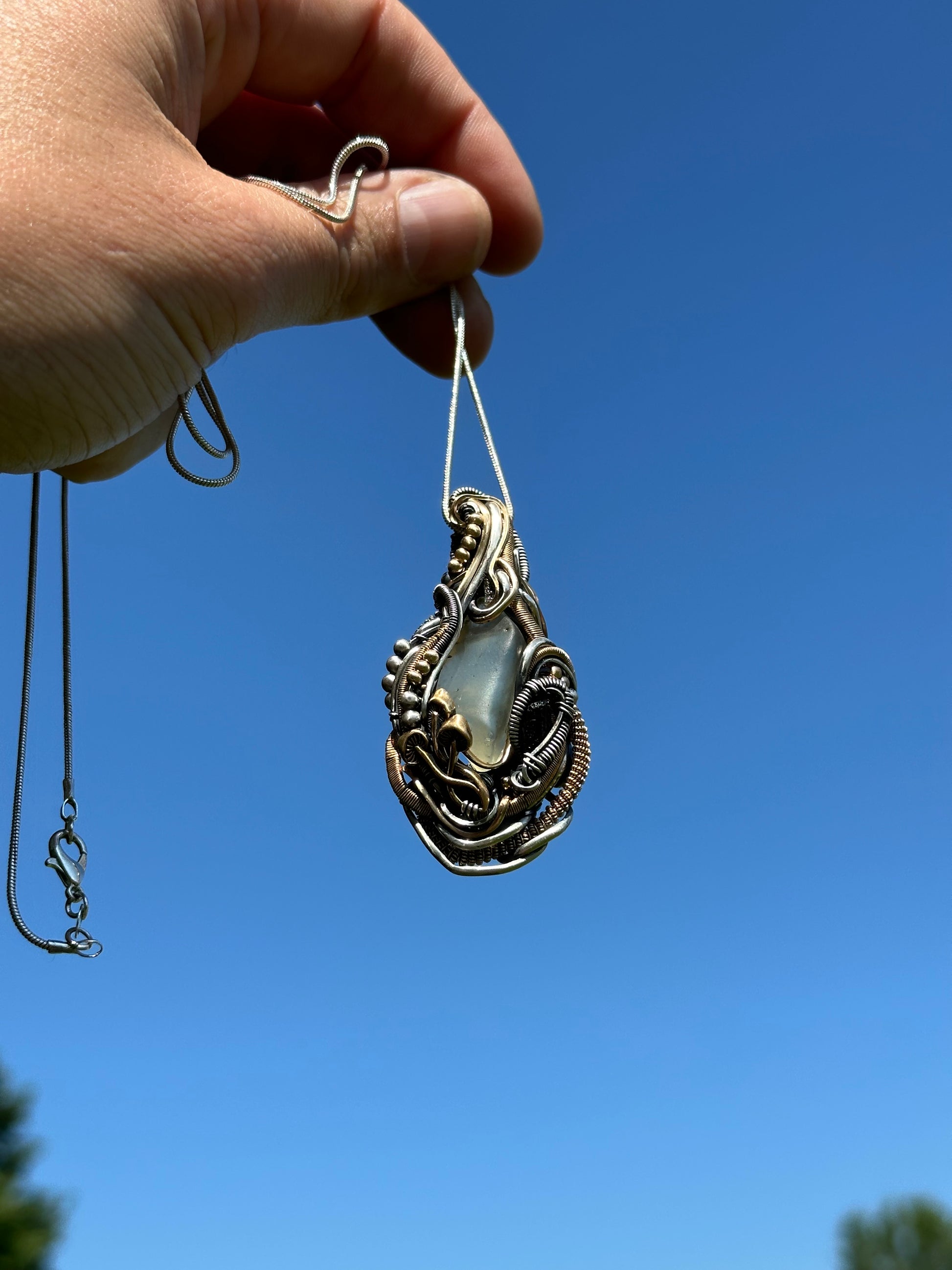 This powerful pendant combines two of the most revered and high-vibrational stones: Libyan Desert Glass and Moldavite.