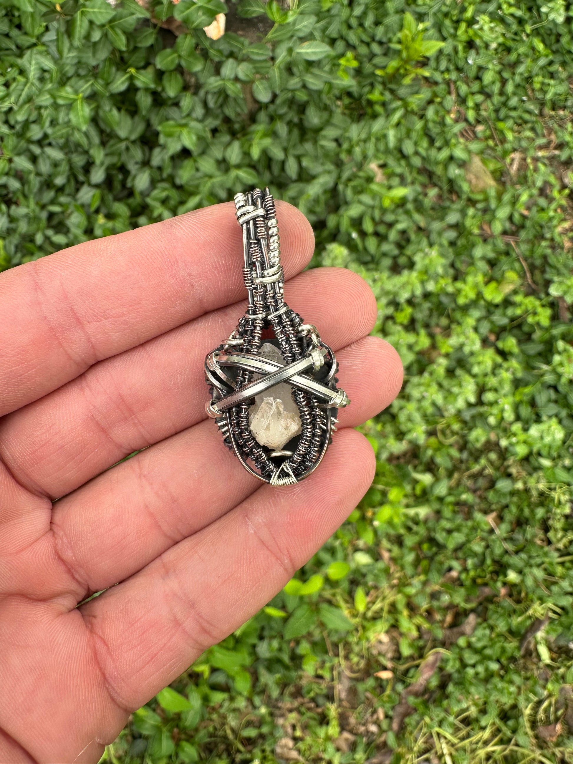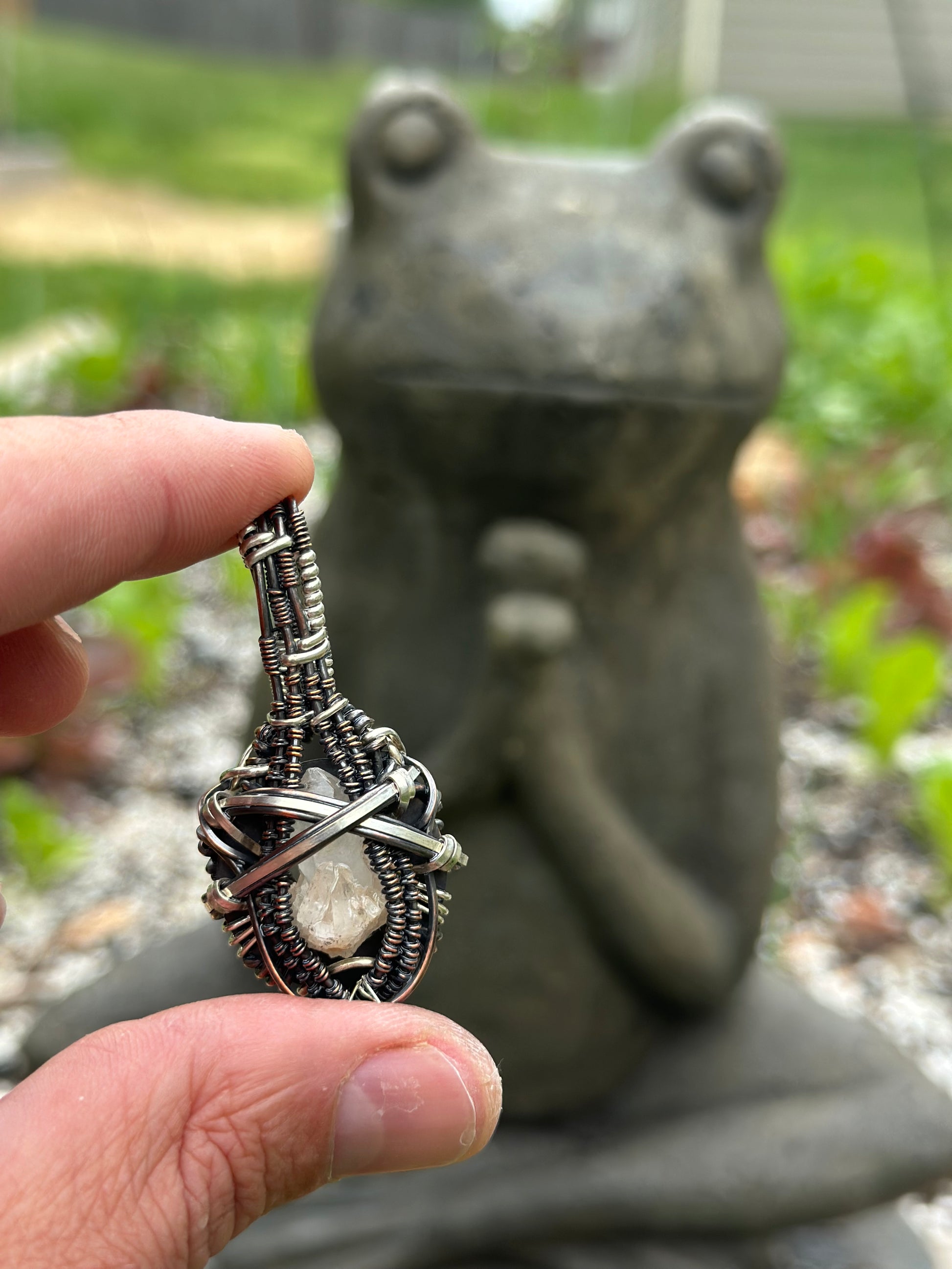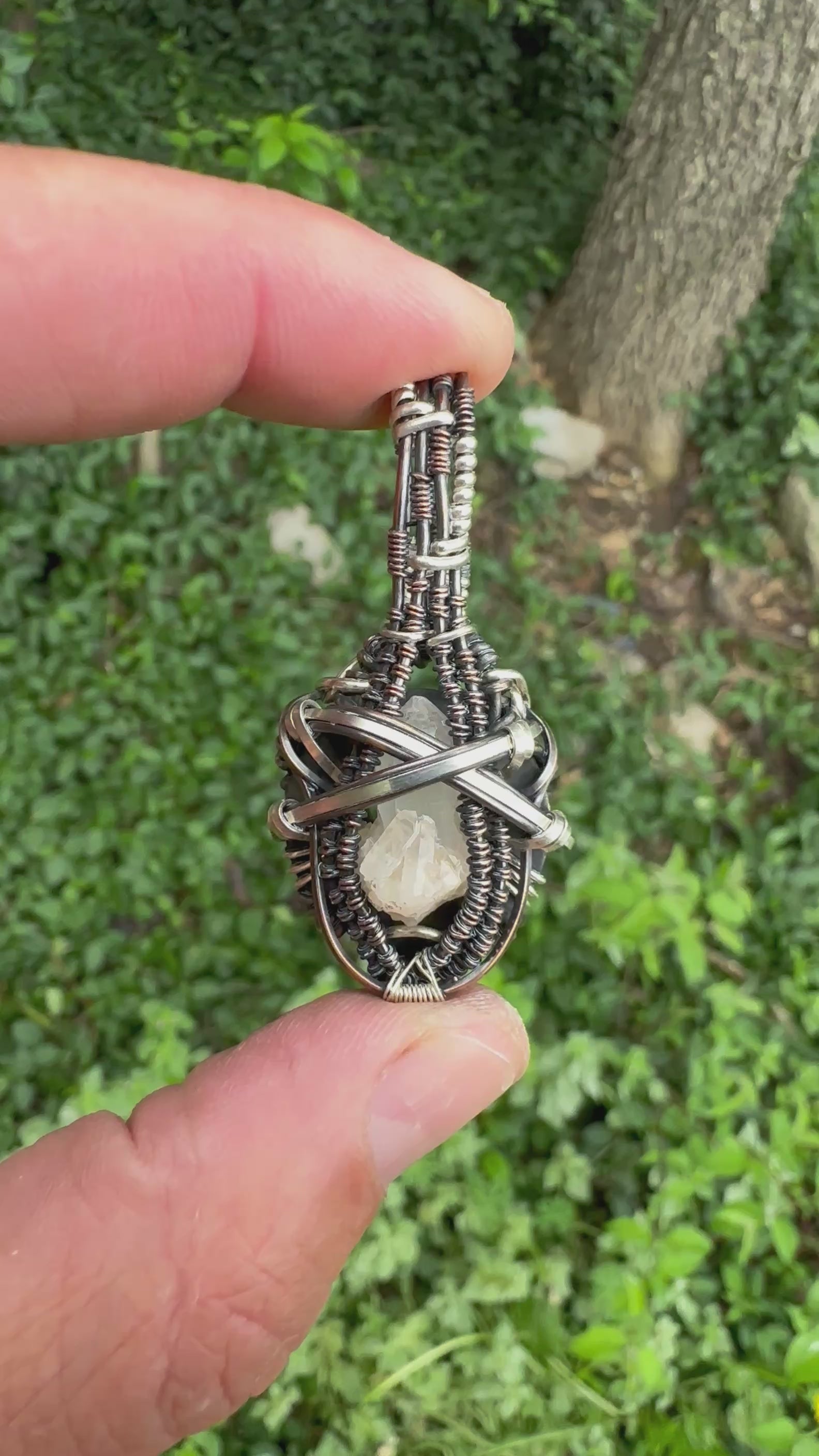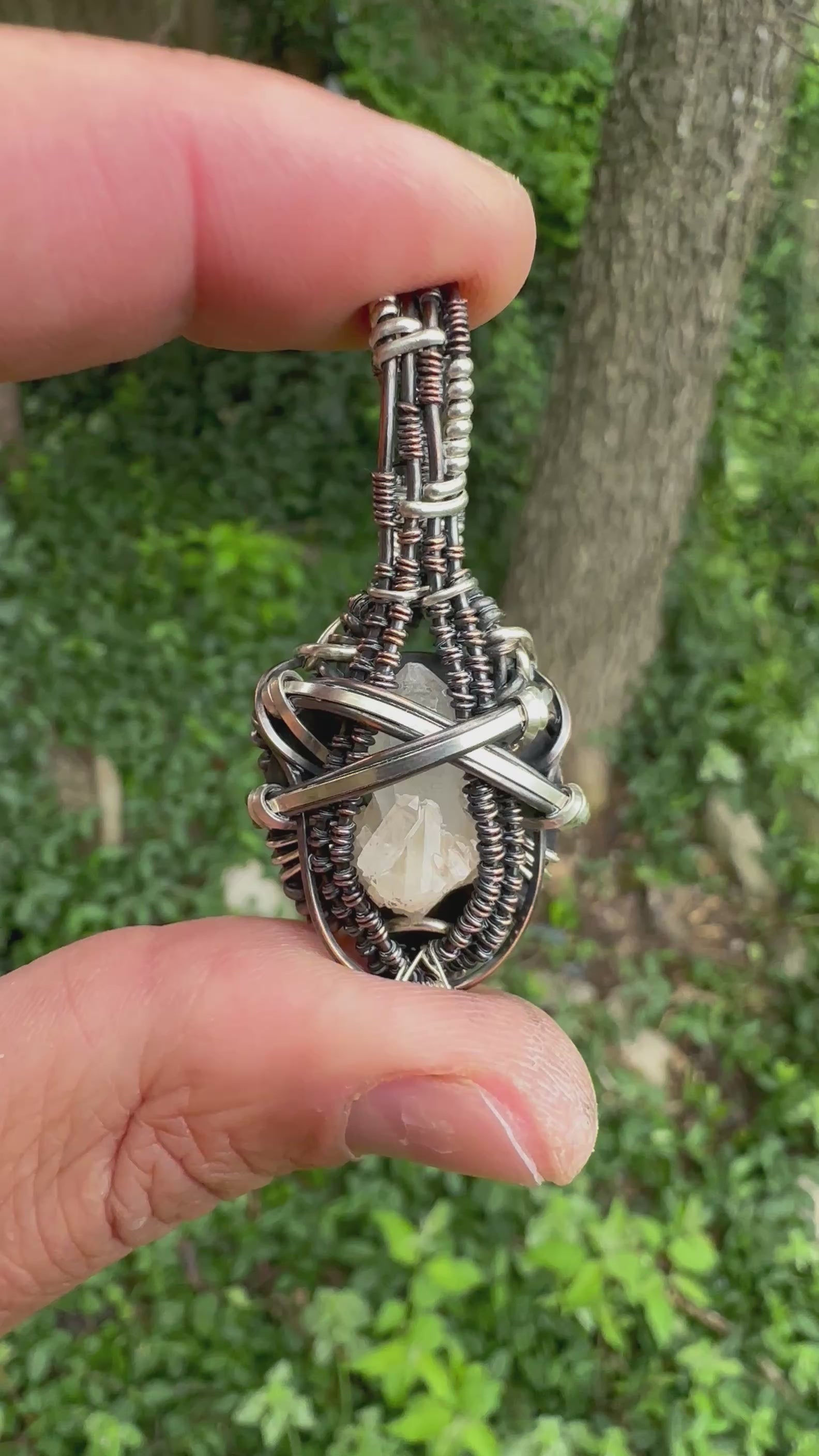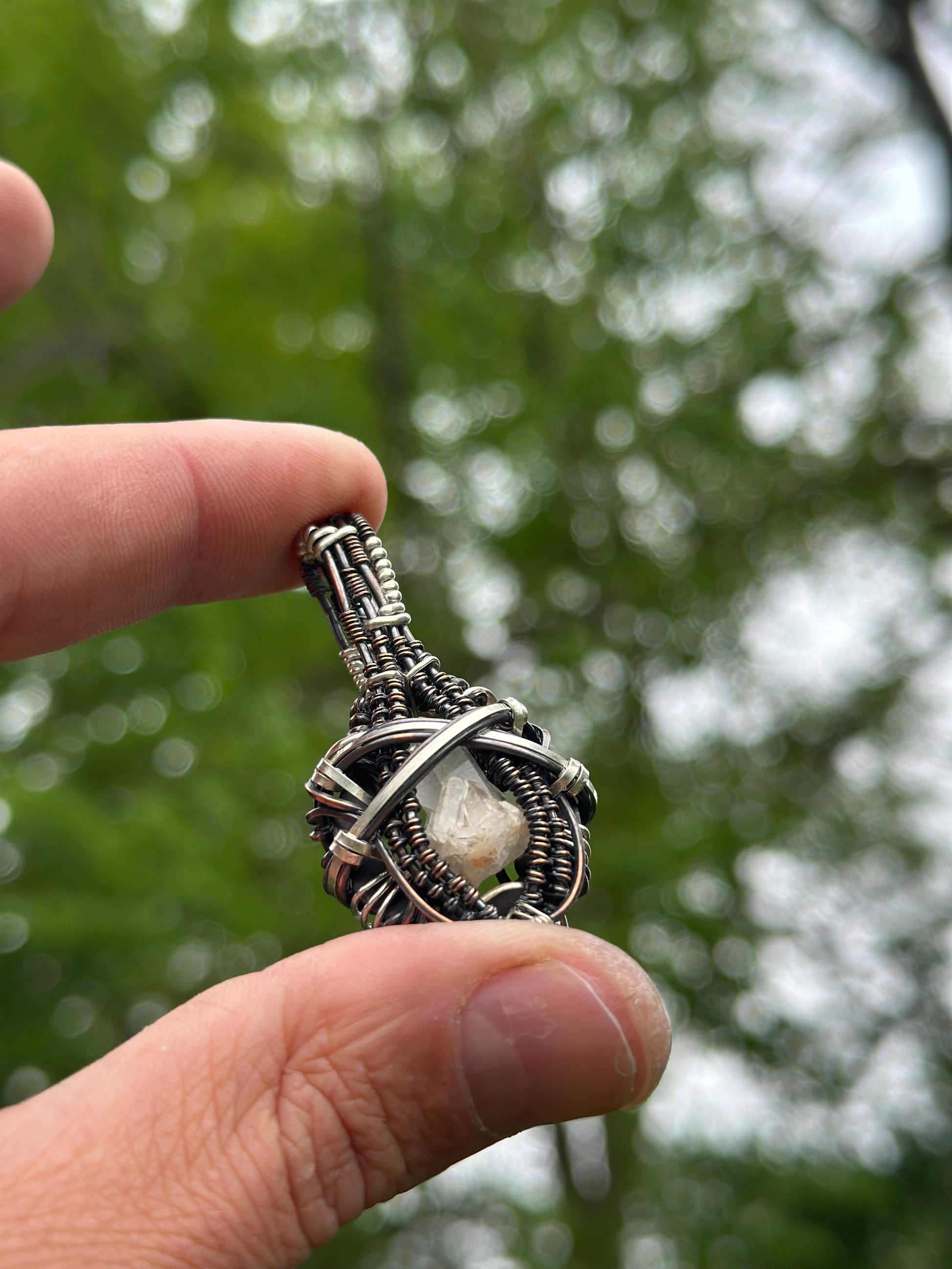 Oxidized .925 Sterling Silver, Copper pendant holding a hand mined Quartz cluster from the deep mountains of Arkansas. This pendant is unadulterated and resonates at a high frequency, cleansed in water and charged under the sun and moonlight.
