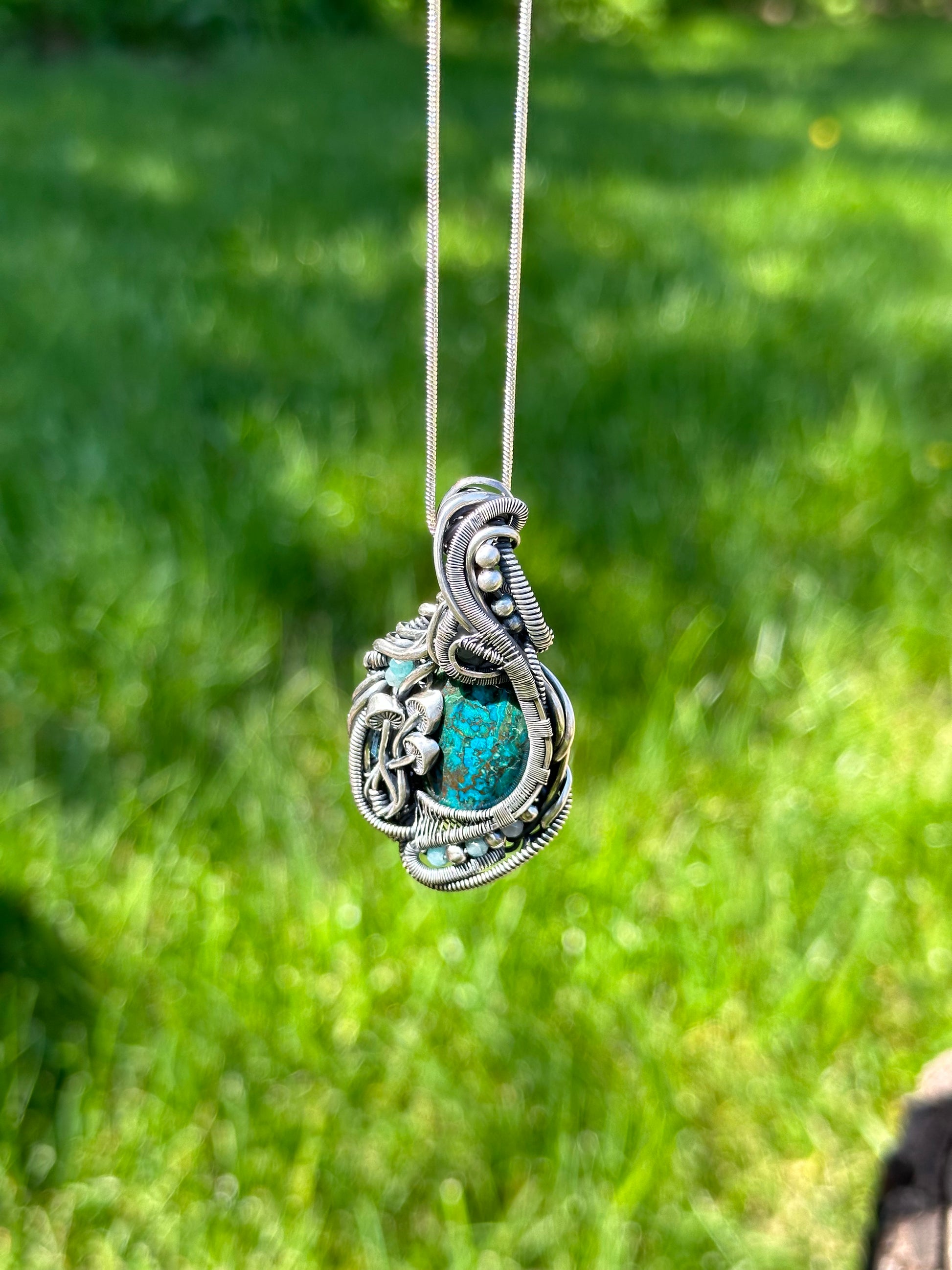 Handcrafted by Michael Delaney, this piece presents chrysocolla, amazonite, and aquamarine, meticulously wrapped with mushroom elements. This piece brings a sense of peace and balance to the wearer during difficult times.