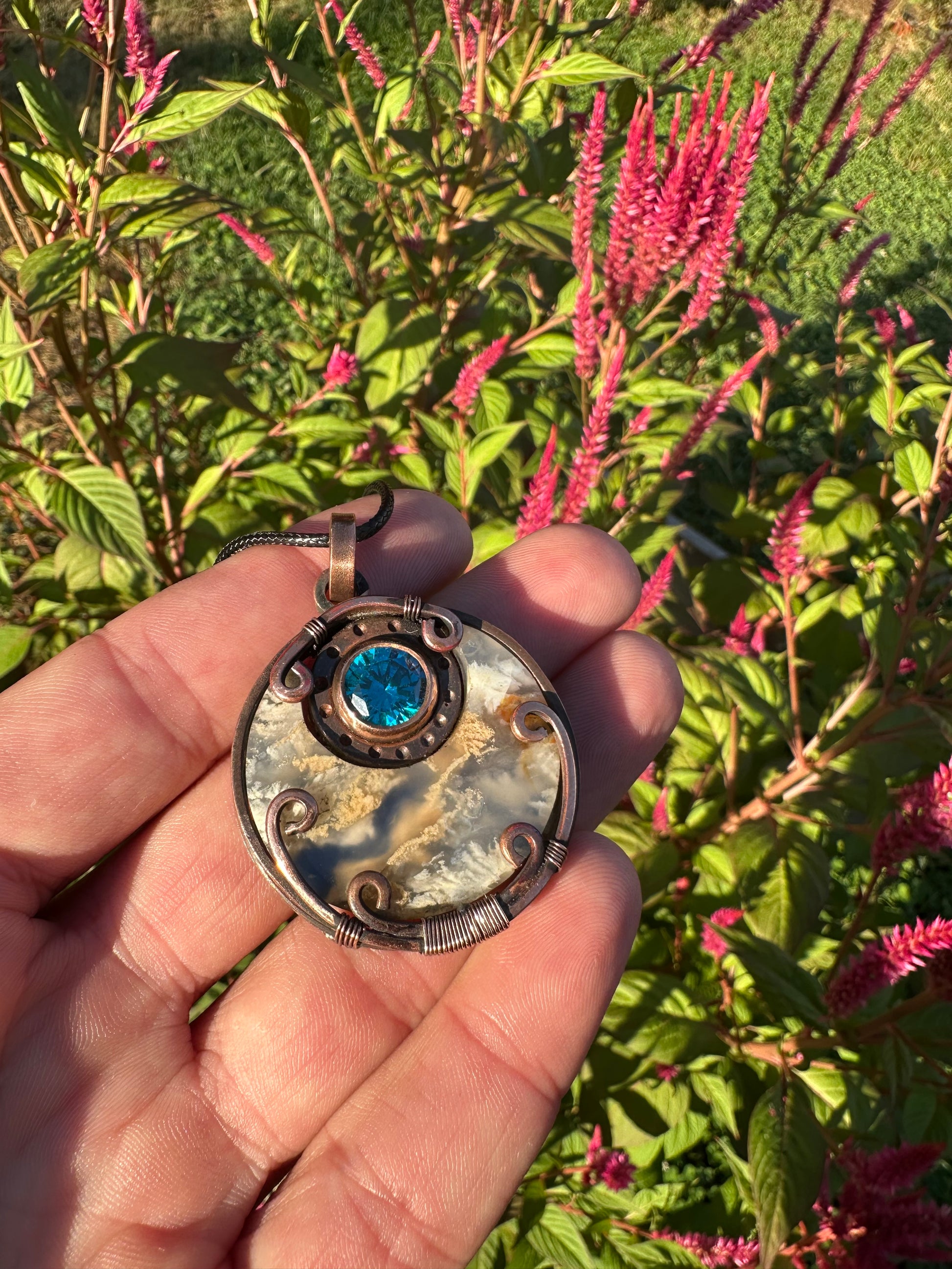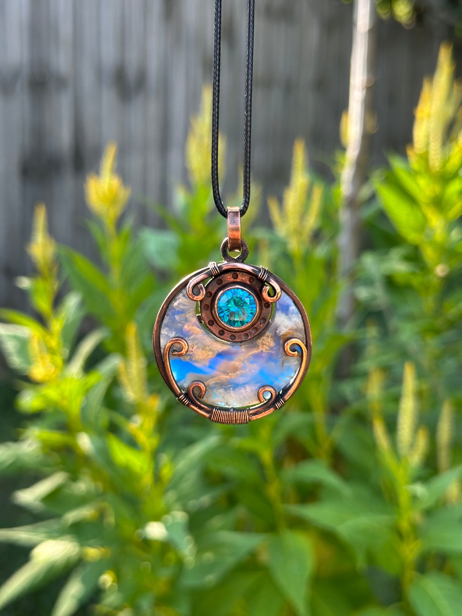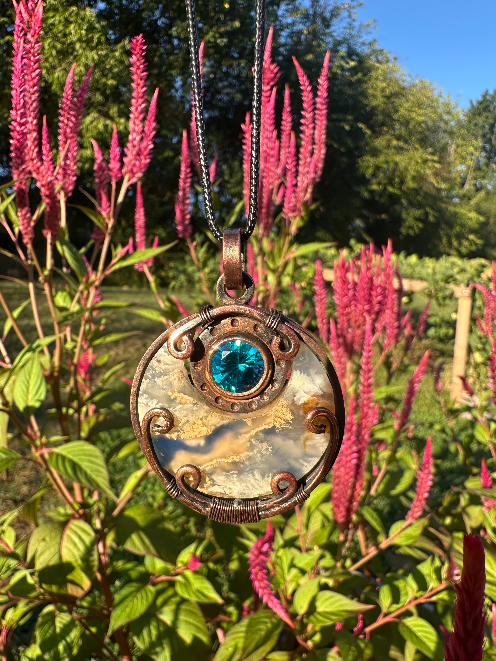 New 🔥 just dropped in! This hand-crafted pendant whispers from the stars with a bright, luminous faceted Topaz and a blue plume agate doublet that resembles a bright blue sky with floating clouds!Â